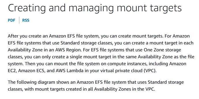 4. Create a mount target in each Availability Zone of the VPC. Use the mount target to mount the EFS file system on the instances in the respective Availability Zone.
