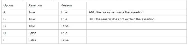 Lines 1 to 4 in the table below consist of an assertion statement and a reason statement. For each line identify the appropriate option, from options A to E, that applies. Each option can be used once, more than once or not at all.
