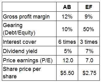 AB and EF are located in the same country and prepare their financial statements to 31 October in accordance with International Accounting Standards. EF supplies AB with a component that is vital to AB's product range. AB is considering acquiring a controlling interest in EF by 31 December 20X4 in order to guarantee future supply. The Board of EF has indicated that such an approach would be postively considered. AB would use its control to make AB the sole customer of EF. The Finance Director of AB has been granted access to EF's management accounts and has conducted some initial analysis from the financial press. The results togther with comparisons for AB for the year to 31 October 20X4 are presented below: