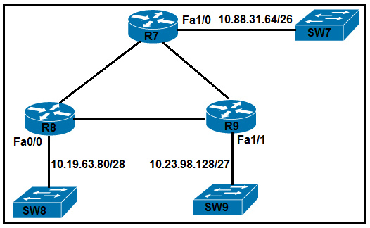 1. R7# interface FastEthernet1/0 ip address 10.88.31.127 255.255.255.192 R8# interface FastEthernet0/0 ip address 10.19.63.95 255.255.255.240 R9# interface FastEthernet1/1 ip address 10.23.98.159 255.255.255.224