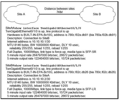 Refer to the exhibit. Site A was recently connected to site B over a new single-mode fiber path. Users at site A report intermittent connectivity issues with applications hosted at site B. What is the reason for the problem?