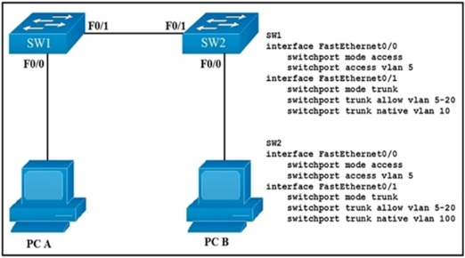 Since SW-1 is configured native VLAN is VLAN10, so traffic coming out of VLAN-10 is untagged, & goes directly to SW-2 Native VLAN: VLAN100, due to VLAN mismatch.