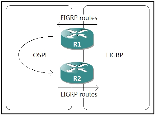 2. Set a tag in the route map when redistributing EIGRP into OSPF on R1, and match the same tag on R2 to allow when redistributing OSPF into EIGRP.