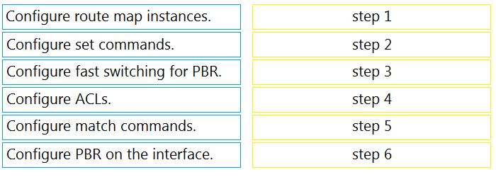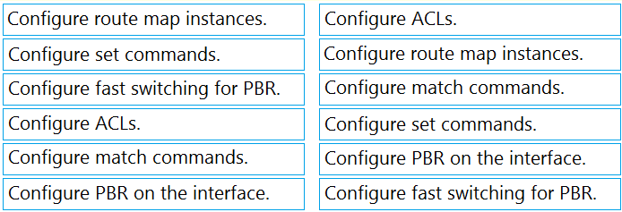 Drag and drop the actions from the left into the correct order on the right to configure a policy to avoid following packet forwarding based on the normal routing path.