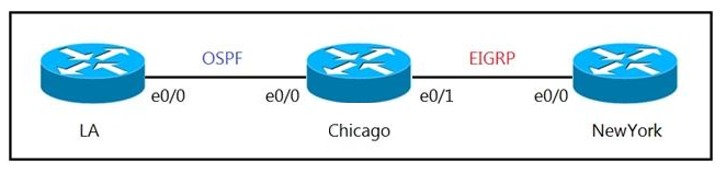 Refer to the exhibit. The network administrator must mutually redistribute routes at the Chicago router to the LA and NewYork routers. The configuration of the Chicago router is this: