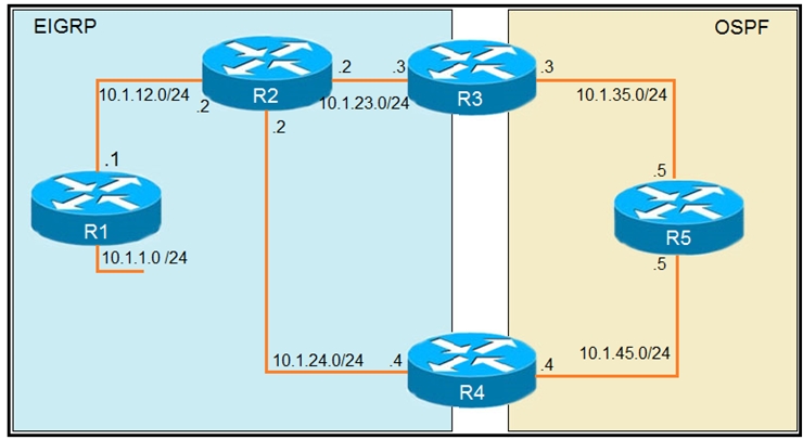Refer to the exhibits. To provide reachability to network 10.1.1.0/24 from R5, the network administrator redistributes EIGRP into OSPF on R3 but notices that R4 is now taking a suboptimal path through R5 to reach 10.1.1.0/24 network.