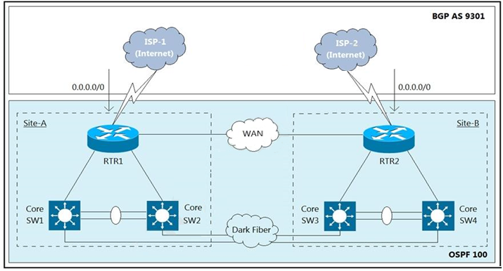 1. Set OSPF Cost 200 at Site-A RTR1, and set OSPF Cost 100 at Site-B RTR2.