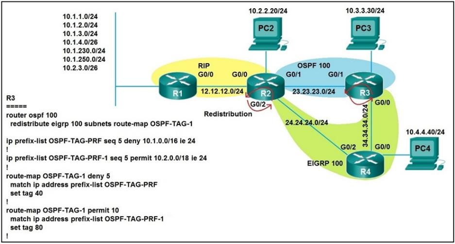 2. RIP learned routes are distributed to OSPF with a tag value of one.
