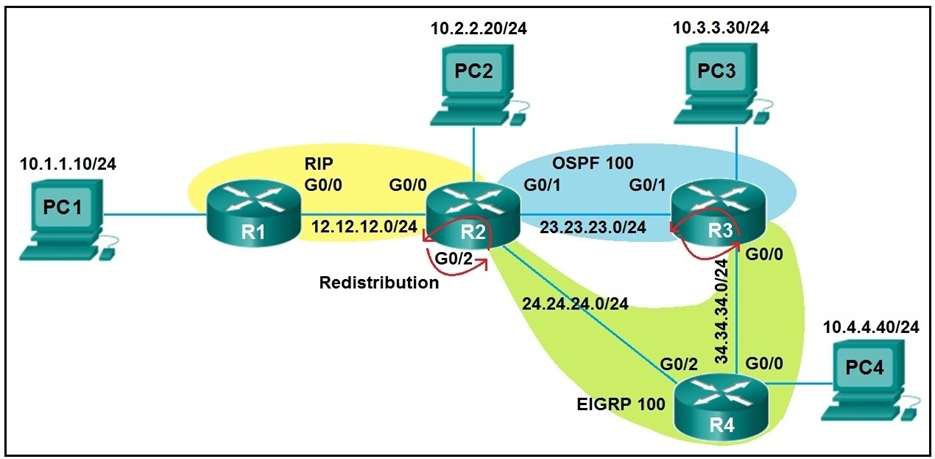 Refer to the exhibit. After redistribution is enabled between the routing protocols; PC2, PC3, and PC4 cannot reach PC1. Which action can the engineer take to solve the issue so that all the PCs are reachable?