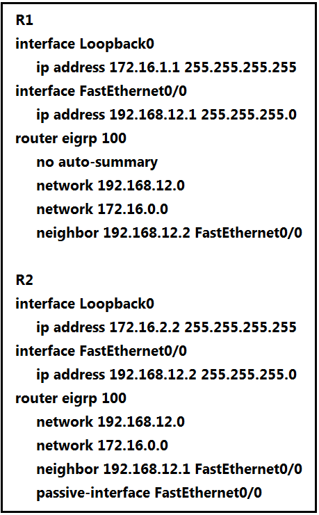 2. Add the passive-interface command to the R1 configuration so that it matches the R2 configuration.