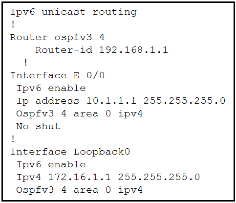 1. Disable OSPF for IPv4 using the no ospfv3 4 area 0 ipv4 command under the E 0/0 interface.