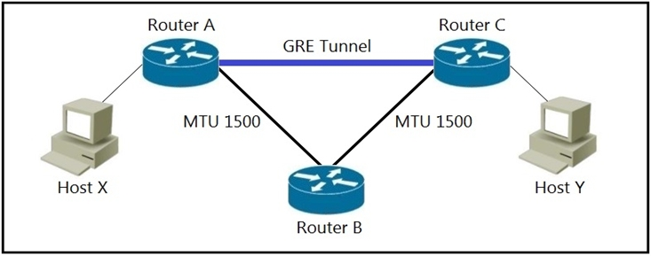 What happens when a 1500-byte IPv4 packet traverses the GRE tunnel from host X to host Y, assuming the DF bit is cleared?