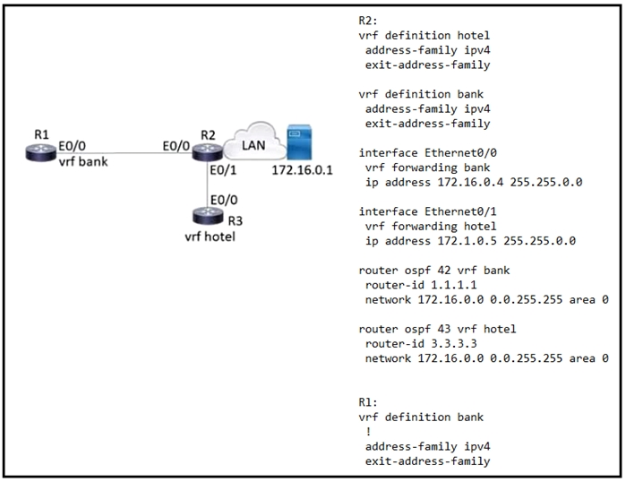 2. interface Ethernet0/0 vrf forwarding hotel ip address 172.16.0.7 255.255.0.0 router ospf 44 vrf Hotel network 172.16.0.0 0.0.255.255 area 0