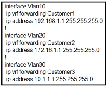 3. ip route vrf Customer1 172.16.1.0 255.255.255.0 172.16.1.1 Customer2 ip route vrf Customer2 192.168.1.200 255.255.255.255 192.168.1.1 Customer1