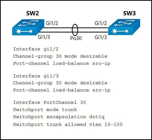 A port channel is configured between SW2 and SW3. SW2 is not running a Cisco operating system. When all physical connections are made, the port channel does not establish.