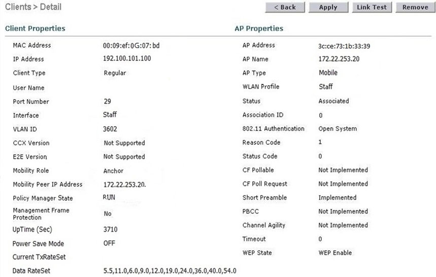 The WLC administrator sees that the controller to which a roaming client associates has Mobility Role Anchor configured under Clients > Detail.