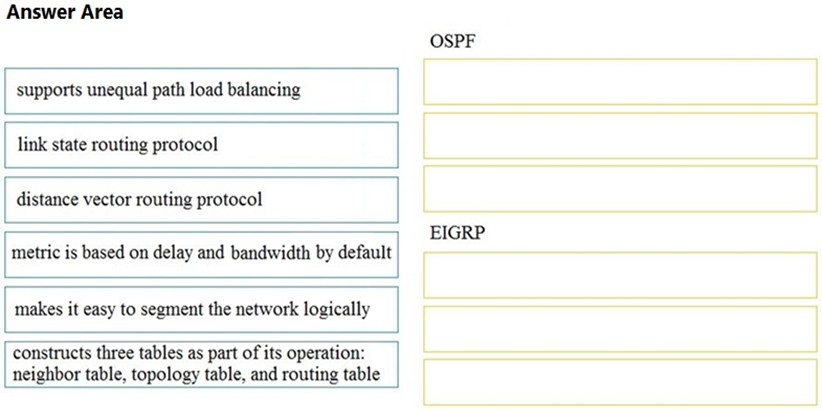 Drag and drop the characteristics from the left onto the correct routing protocol types on the right.
