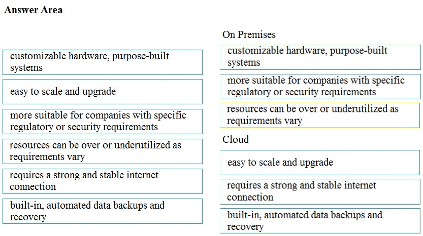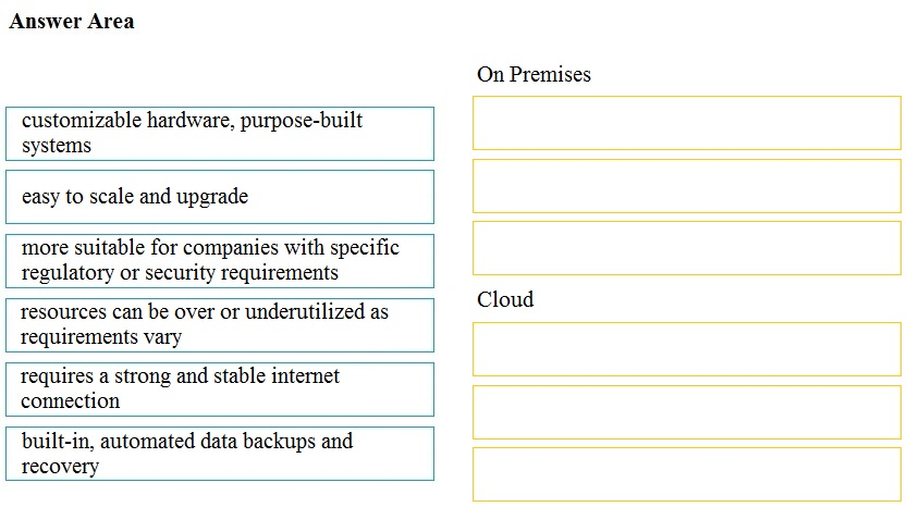 Drag and drop the characteristics from the left onto the appropriate infrastructure deployment types on the right.