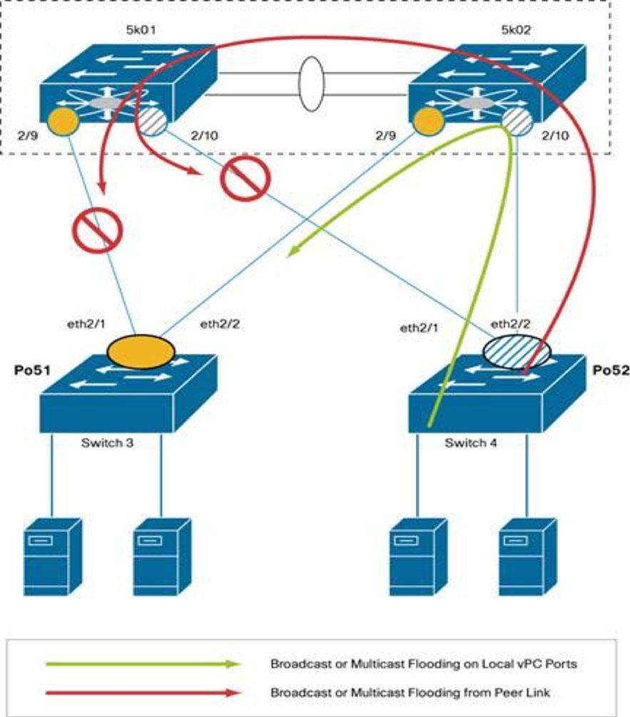Duplicate Frames Prevention in vPCOne of the most important forwarding rules for vPC is that a frame that enters the vPC peer switch from the peer link cannot exit the switch from a vPC member port.Figure shows switch-es 3 and 4 connected to 5k01 and 5k02 with vPCs Po51 and Po52. If one of the hosts connected to switch 4 sends either an unknown unicast or a broadcast, this traffic may get hashed to port eth2/2 on PortChannel 52. 5k02 receives the broadcast and needs to forward it to the peer link for the potential orphan ports on 5k01 to receive it.Upon receiving the broadcast, 5k01 detects that this frame is coming from the vPC peer link. Therefore, it does not forward it to port 2/9 or 2/10; if it did, a duplicate frame on switch 3 or 4, respectively, would be created.If a host on switch 4 sends a broadcast, 5k02 will correctly forward it to Po51 on port 2/9 and place it on the peer link. 5k01 will prevent this broadcast frame from exiting onto port 2/9 or 2/10 because this frame entered 5k01 from a vPC peer link. Should eth2/2 on switch 3 go down, port 2/9 on 5k01 would become an orphan port and as a result will receive traffic that traverses the peer link.