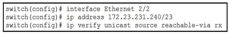The ג€ip verify unicast source reachable-via rxג€ command enables Unicast RPF in strict mode. To enable loose mode, administrators can use the any option to enforce the requirement that the source IP address for a packet must appear in the routing table.