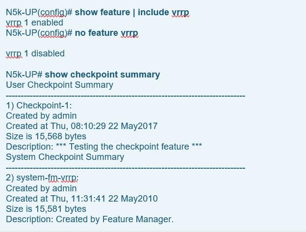 The system-generated checkpoint name convention has the format system-fm-feature. To help illustrate this automated feature we attempted to disable the VRRP feature on our Nexus 5000 therefore triggering the system to create a checkpoint. First we confirm the VRRP feature is enabled by issuing the show feature | include vrrp command then disable it and then verify it has been disabled: