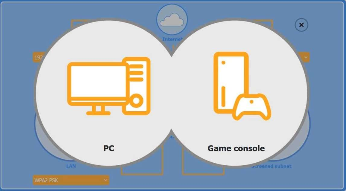 2. Game console: place on the Wireless AP (so it can use chat and extra services over WPA2 PSK).