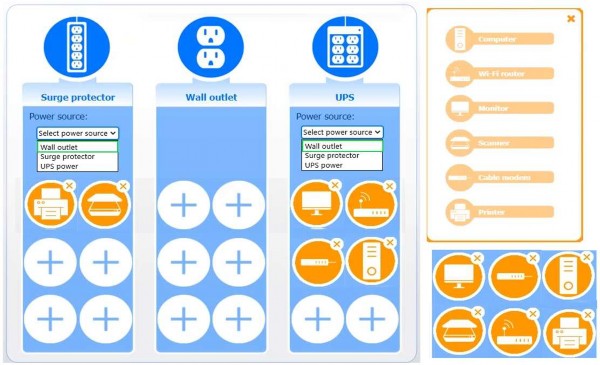 Based on the customer's requirements, connect the customer's devices to the proper outlets. Then, use the drop-down menus to select the power source for the surge protector and UPS.