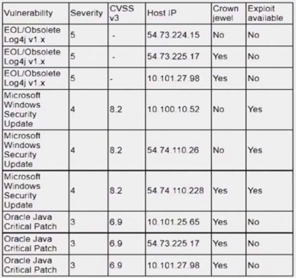 An analyst is reviewing a vulnerability report for a server environment with the following entries: