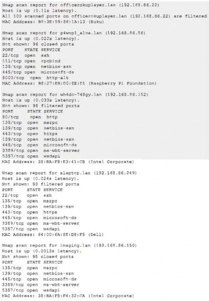 Due to reports of unauthorized activity that was occurring on the internal network, an analyst is performing a network discovery. The analyst runs an Nmap scan against a corporate network to evaluate which devices were operating in the environment. Given the following output: