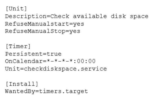 A Linux administrator is scheduling a system job that runs a script to check available disk space every hour. The Linux administrator does not want users to be able to start the job. Given the following:The Linux administrator attempts to start the timer service but receives the following error message:Which of the following is MOST likely the reason the timer will not start?