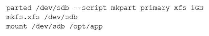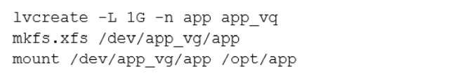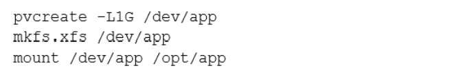 A systems engineer is adding a new 1GB XFS filesystem that should be temporarily mounted under /ops/app. Which of the following is the correct list of commands to achieve this goal?