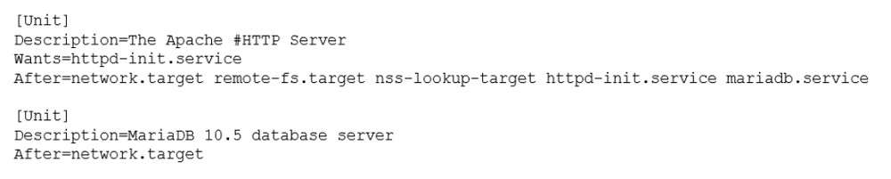 A Linux administrator has installed a web server, a database server, and a web application on a server. The web application should be active in order to render the web pages. After the administrator restarts the server, the website displays the following message in the browser: Error establishing a databaseconnection. The Linux administrator reviews the following relevant output from the systemd init files:The administrator needs to ensure that the database is available before the web application is started. Which of the following should the administrator add to the HTTP server .service file to accomplish this task?