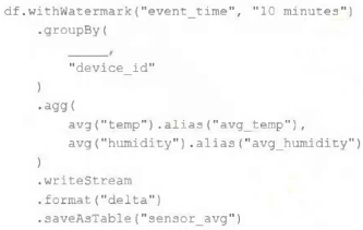 A junior data engineer has been asked to develop a streaming data pipeline with a grouped aggregation using DataFramedf. The pipeline needs to calculate the average humidity and average temperature for each non-overlapping five-minute interval. Events are recorded once per minute per device.