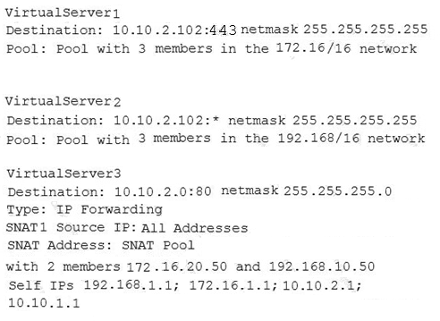 An LTM has the 3 virtual servers, four self IP addresses defined and the networks shown in the exhibit. Selected options for each object are shown below. Settings not shown are at their defaults.