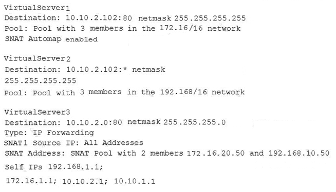 Click the Exhibit Button an LTM has the 3 virtual servers, a SNAT defined, four self IP addresses defined, and the networks shown in the exhibit. Selected options for each object are shown below. Settings not shown are at their defaults.