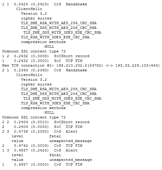 The LTM Specialist does an ssldump on the virtual server and receives the results as per the exhibit.