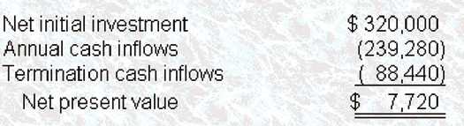 The net present value of a capital project is derived by calculating three amounts and discounting them at the appropriate interest rate: the net initial investment (for which the rate is always 0%), the annual cash inflows, and the termination cash inflows. The net initial investment itself consists of three components: the purchase of new equipment, the increase in working capital, and the proceeds from the disposal of any old equipment. For this project, this amount is $320000 ($120,000 + 200,000 + $0). Since this amount is paid out today, its present value is $320,000, i.e., no discounting is performed. The second element of the project as a whole is the annual cash inflows. This has two components: the cash inflows from operations and the depreciation tax shield arising from the purchase of new equipment. Since the effects of income taxes are not relevant to this problem, only the first of these components requires calculation. The annual net operating revenue is $80,000 ($400,000--$250,000--$70,000). Discounted as an ordinary annuilyfor5 years at 20%, its present value is $239,280 ($80,000 x 2.991). The third and final element is the cash flows upon termination of the project, consisting of the proceeds from the disposal of the equipment involved in the project (again, the effects of income taxes are ignored for this problem) and the recovery of working capital. For this project, this amount is $220,000 ($20,000 + $200,000). Discounted as a single amount to be received in 5 years at 20%, its present value is $88,440 ($220,000 x 0.402). Gibber's total net present value for this capital project can therefore be calculated as follows:
