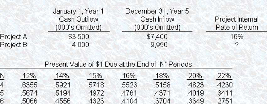 The internal rate of return is the discount rate at which the NPV is zero. Consequently, the cash outflow equals the present value of the inflow at the internal rate of return. The present value of $1 factor for Project B's internal rate of return is therefore 4020 ($4,000,000 cash outflow ÷ $9,950,000 cash inflow). This factor is closest to the present value of $1 for5 periods at 20%.