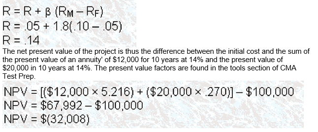 The cost of capital must be determined in order to calculate NPV.Using the Capital Asset Pricing Model to determine the cost of capital where P equals the required rate of return on equally capital, PF equals the risk-free rate, PM equals the market return, and p equals the p coefficient, then