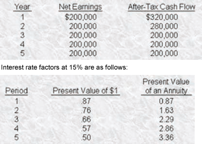 Tonya, Inc. has a cost of capital of 15% and is considering the acquisition of a new machine that costs $800,000 and has a useful life of 5 years. Tonya projects that earnings and cash flow will increase as follows: