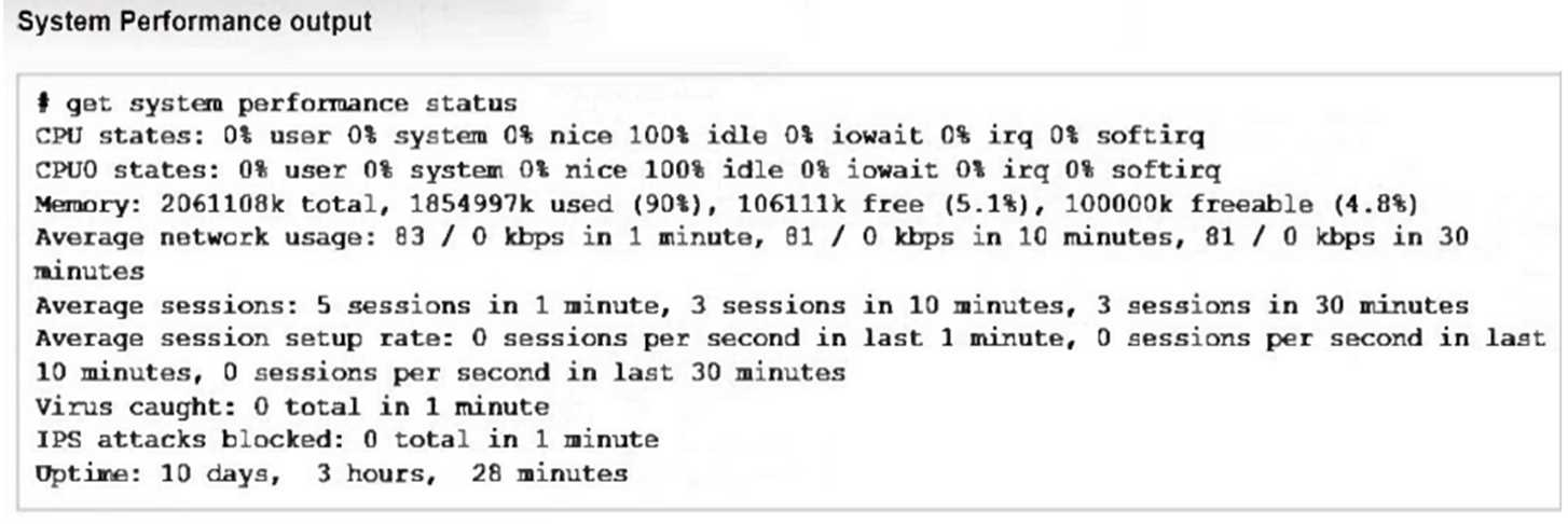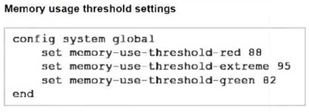 Refer to the exhibits, which show the system performance output and the default configuration of high memory usage thresholds in a FortiGate.