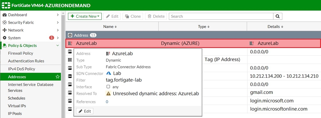 - In the Microsoft Azure portal, access the windows server, obtain the private IP address, and assign the IP address under the FortiGate-VM AzureLab address object.