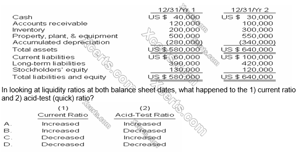 The current ratio is determined by dividing current assets by current liabilities. The acid- test ratio is determined by dividing quick assets by current liabilities. At December 31. Year 1. The current ratio is 6 to 1 [(US $40, 000 + $120, 000 + $200, 000) - $60, 01101. December 31. Year 2, the current ratio is 4.3 to 1 [(US $30, 000 + $100, 000 + $300, 000) - $100, 000]. Hence, there was a decrease in the current ratio. At December 31, Year 1 , the acid-test ratio is 2.667 to 1 [(US $40, 000 + $120, 000) - $60.000]. At December 31, Year 2, the acid-test ratio is 1.3 to 1 [(US $3:0, 000 + $100, 000) - $100, 000]. Thus, the acid- test ratio also declined. An entity's financial statements for the current year are presented below: