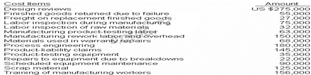 The Categories of quality costs include conformance costs (prevention and appraisal) and nonconformance costs(internal failure and external failure).appraisal costs embrace such activities as statistical quality control programs. inspection, and testing. thus, the cost of detecting nonconfoming products is an appraisal cost. listed below are costs of quality that a manufacturing company has incurred throughout its operations, the company plans to prepare a report that classified these costs into the following four categories: preventive costs, appraisal costs, internal failure costs, and external failure costs.
