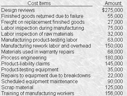 Prevention costs are incurred to prevent defects. Appraisal costs are incurred to detect defective output during and after the production process. Internal failure costs are associated with defective output discovered before shipping. External failure costs are associated with defective output discovered after it has reached the customer.