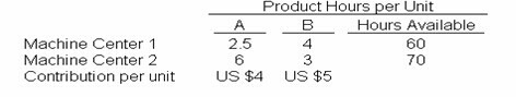 The linear programming solution is subject to constraints on the availability of machine hours in both centers. For example, products A and B require 2.5 and 4 hours per unit, respectively, in Machine Center 1, but only 60 hours are available. Hence, the optimal production of A and B to the following constraint: