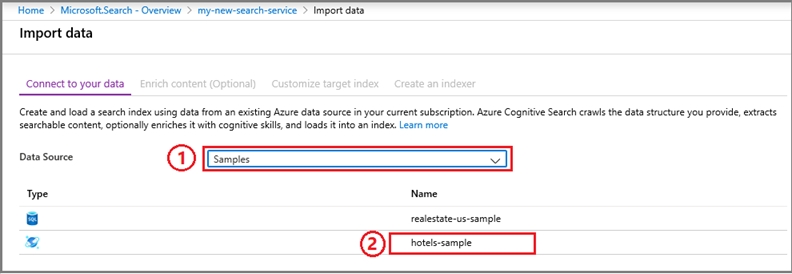 Step 6: In the wizard, click Connect to your data > Samples > hotels-sample. This data source is built-in. If you were creating your own data source, you would need to specify a name, type, and connection information. Once created, it becomes an "existing data source" that can be reused in other import operations.