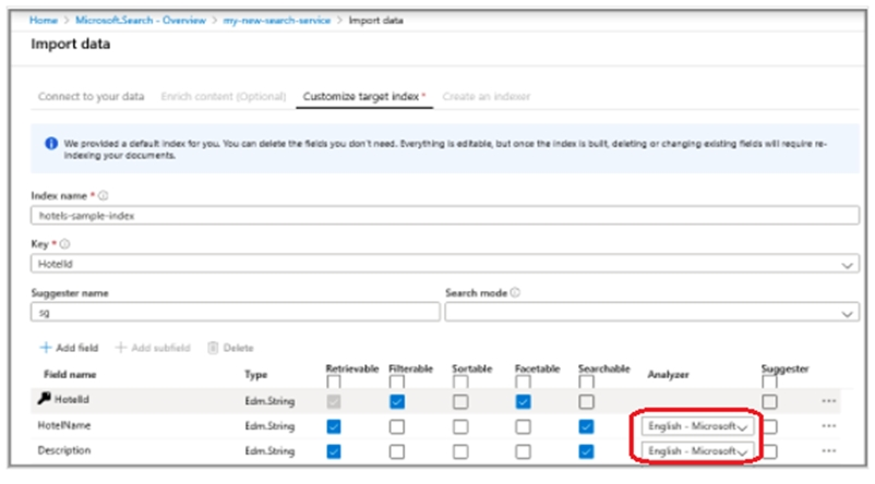 You need to create a search service named search12345678 that will index a sample Azure Cosmos DB database named hotels-sample. The solution must ensure that only English language fields are retrievable.