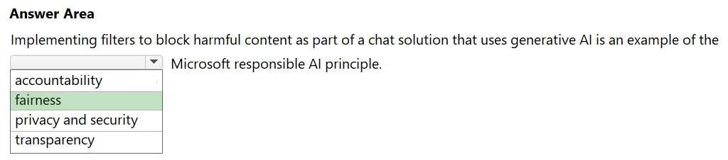 Implementing filters to block harmful content in a generative AI-powered chat solution is an example of the Safety principle in Microsoft's Responsible AI framework.