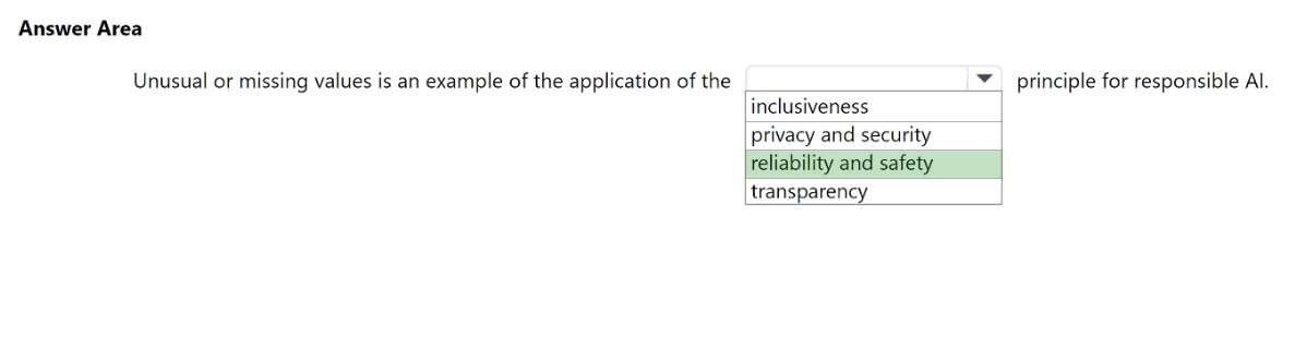 Unusual or missing values is an example of the application of the ______ principle of responsible AI.